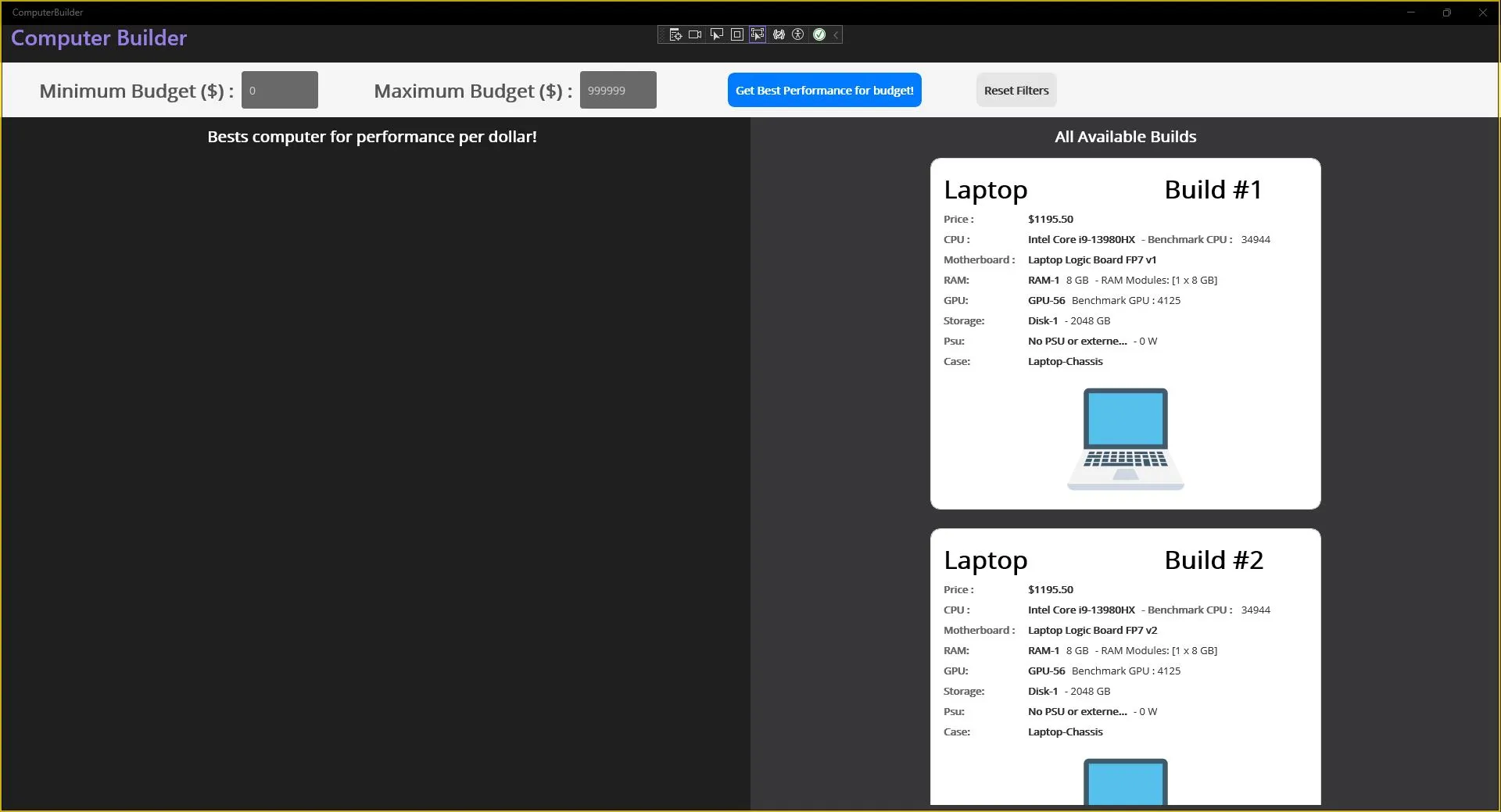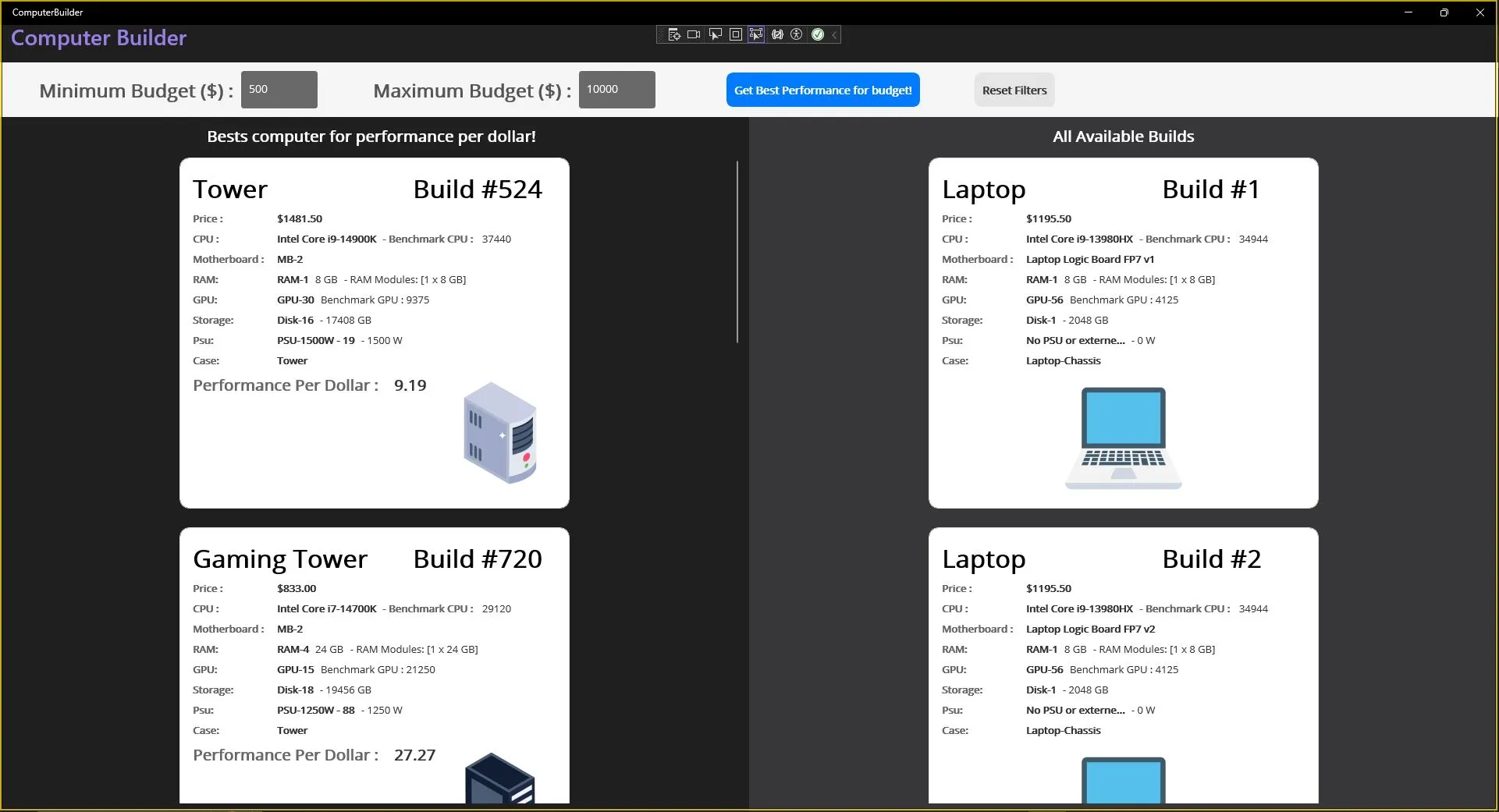 I wanted to create a project that included AI and I thought of making the project “PC Build Optimizer”. The goal of this application is to put a budget (minimum and maximum) and the application will suggest the best performance per dollar for each category of computer. The categories are : Laptop, Gaming Laptop, Tower, Gaming Tower, Mini-PC, Server and workstation. I trained 2 machine learning models. The first one is responsible to tell which computer belong to which category. It take the components of the computer to tell its answer and it use Data Classification to do so. The second machine learning model is to tell the performance per dollar for each build. It look at the performance of each component and give a result. It use “Value Prediction” to accomplish the task.